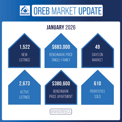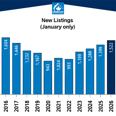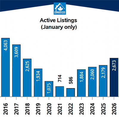New listings totalled 1,522 units in January, an increase of 8.8 percent year over year. Active listings rose to 2,673, up 22.7 percent from last January. While inventory remains elevated compared to recent seasonal norms, the pace of growth has slowed.
